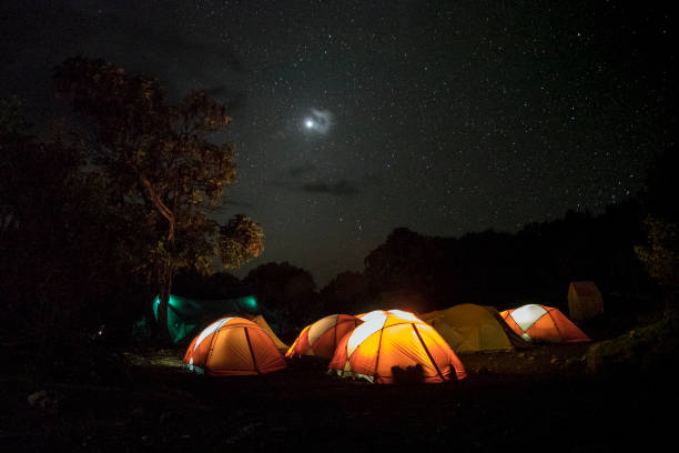 high-quality, spacious all-weather tents equipped with thick foam mattresses and warm sleeping bags, alongside a dedicated mess
